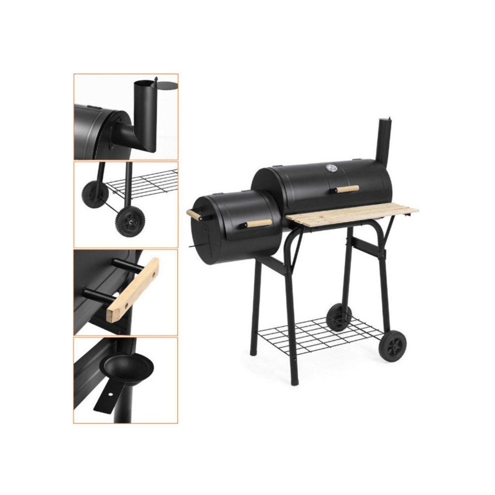Light cast iron horizontal barbecue smoker, ideal for grilling and smoking food. Thanks to its shape, the heat distribution is evenly distributed and the internal temperature is controlled by the thermometer on the cover at all times (temperature from 50 – 350. C). The air flows freely through the side air duct when needed, while the grills are removable and easy to clean. It has handles made of wood so that they do not heat up, 2 wheels for easy transport, as well as an additional auxiliary grill at the bottom and a wooden front shelf so that you can have all the necessary tools near you.