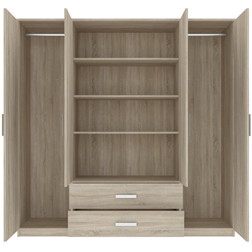 Wardrobe has 4 shelves, 2 drawers, 2 mirror doors and compartments for hangers
